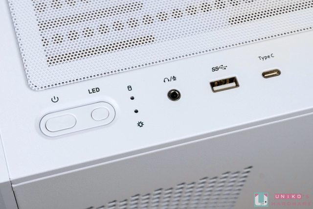前置 I/O 也位於機殼頂部,除了電源鍵外,另有 LED 模式切換鍵、3.5 mm 耳麥孔、USB
