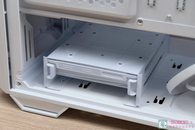 硬碟架位於電源艙內,最高可以「加蓋」方式,安裝 2 顆 3.5” 或 2.5” 硬碟。另外,