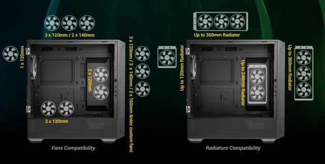 前方採用網孔面板設計,預裝兩顆 160 mm 風扇做進氣,後方還有搭配一顆 120 mm 風扇排