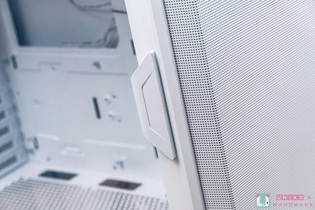 透側面板下方,電源艙外側延續正面網狀散熱的設計語言,透側面板有磁吸式把手,稍微施