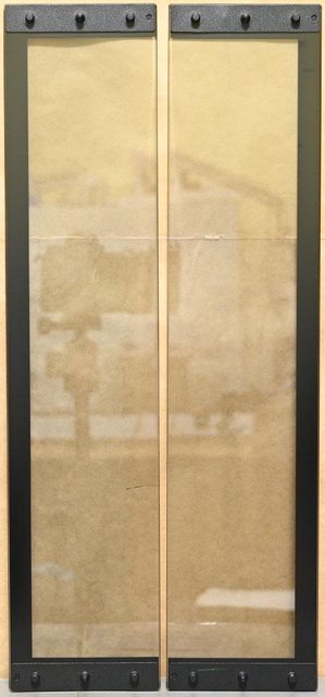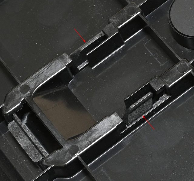 ▼正面強化玻璃背面,上緣塑膠條有2個押扣(紅色箭頭),下緣金屬條有插入式固定架