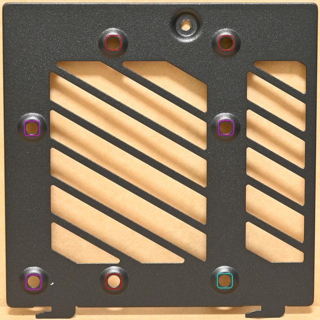 ▼後方蓋板背面兩側共有4個卡榫,通風口旁的固定孔可安裝2個120mm(水藍色孔)/140mm(