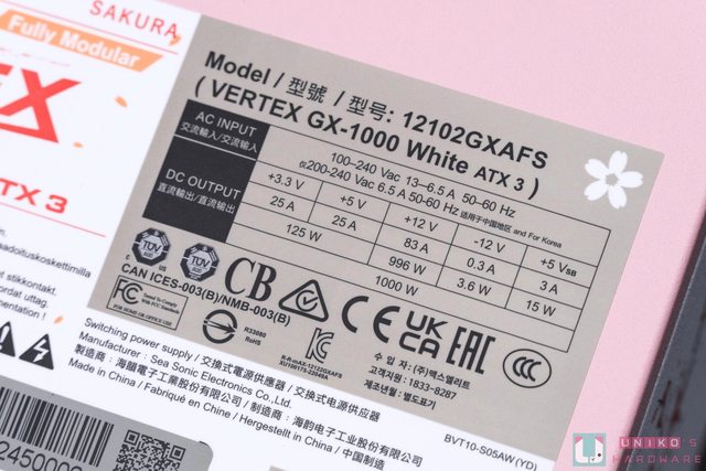 櫻花版其實是 VERTEX GX-1000 的特殊樣式款,因此規格基本上是一致的,同為 1000W 金