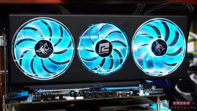 正面 3 顆風扇皆有 RGB 燈效,但是只能透過卡上的開關切換關閉 / 藍色 / 紫色,沒有支