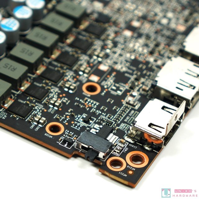 維持雙 PCI-E 8-PIN 輸入,旁邊還有一個實體切換,控制風扇和背板暗黑犬的發光顏色,P