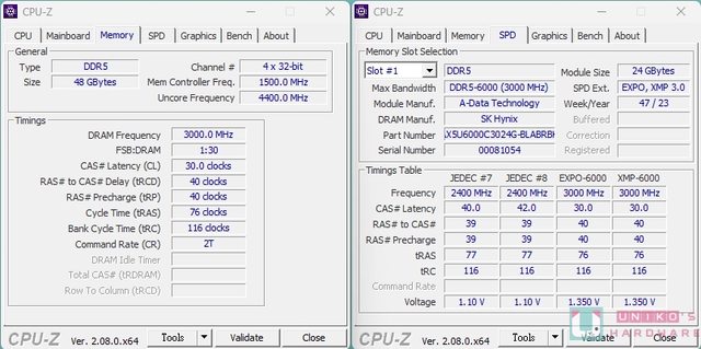 CPU-Z 規格資訊,左圖可以看到總容量為 48GB,右圖顯示資訊 XPG LANCER BLADE RGB DDR