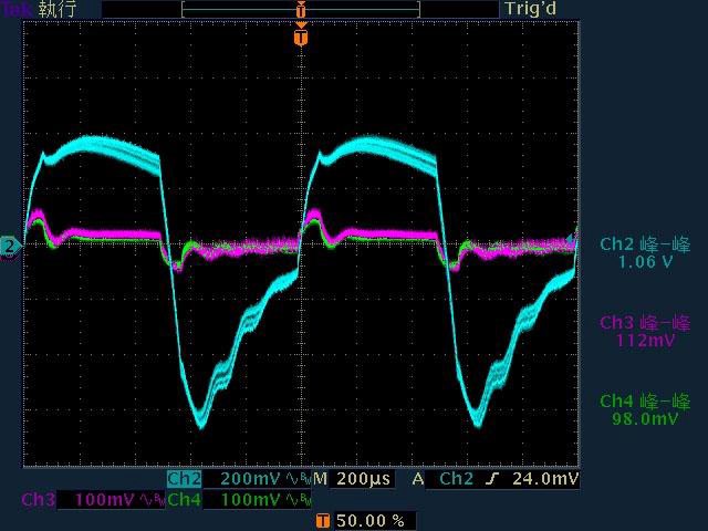 以下波形圖,CH2藍色波形為12V電壓波形,CH3紫色波形為5V電壓波形,CH4綠色波形為
