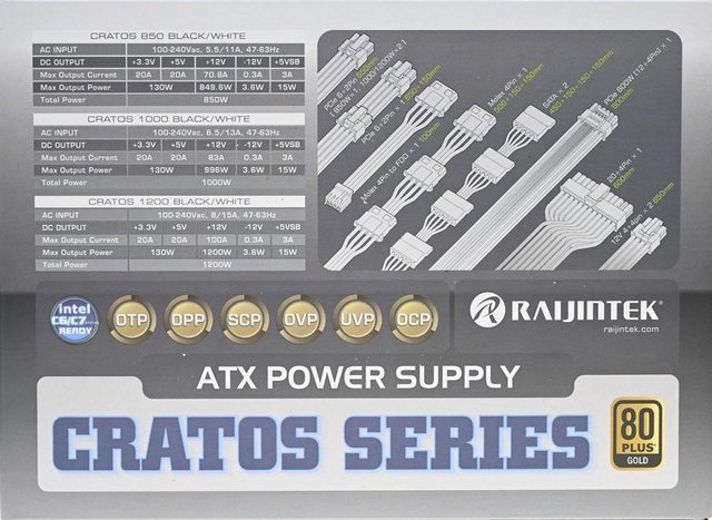 表、保護圖示、RAIJINTEK商標、原廠網址、CRATOS系列名稱、80PLUS金牌認證