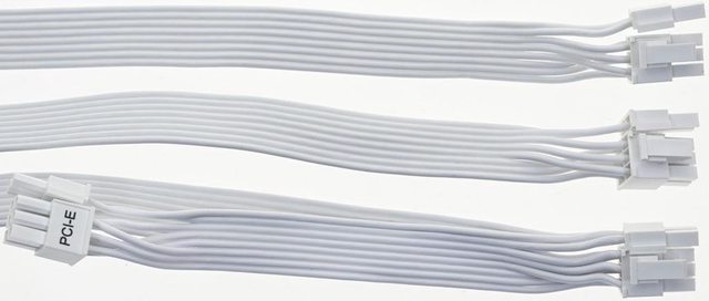 ▼3條顯示卡電源白色帶狀模組化線路,提供4個PCIE 6+2P接頭,2條單接頭18AWG線路長