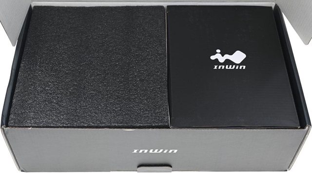 ▼打開外盒,盒子開口側邊有Inwin商標,電源本體放在左側緩衝包材內,其他配件放在
