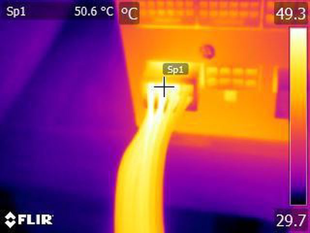 ▼單條PCIE 6+2P連續輸出21A(252W)10分鐘後的電源端模組化接頭紅外線熱影像圖(附註