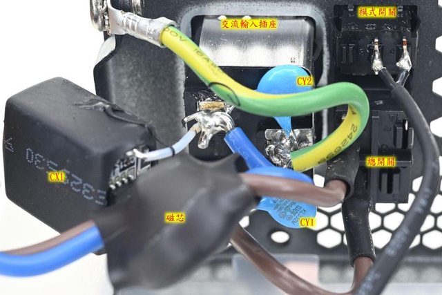 ▼交流輸入插座焊點加上2個Y電容(CY1/CY2)及1個X電容(CX1),X電容本體/接腳、磁芯及