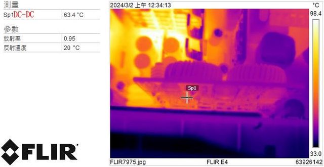 ▼電源供應器滿載輸出下DC-DC的紅外線熱影像圖(附註:安裝位置環境溫度會影響測試結