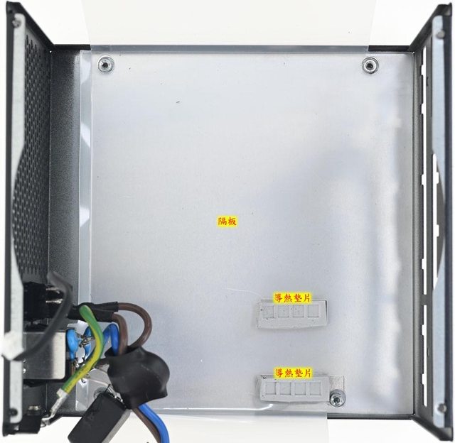 ▼外殼底部透明隔板於二次側MOSFET導熱墊片下方開孔,接觸隔板與外殼之間的鋁板,協