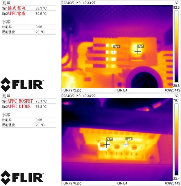▼電源供應器滿載輸出下橋式整流/APFC電感(上圖)及APFC MOSFET/APFC DIODE(下圖)的