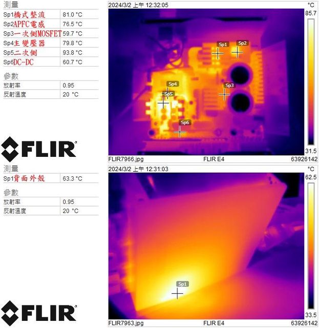 ▼電源供應器滿載輸出下內部(上圖)及背面外殼(下圖)的紅外線熱影像圖(附註:安裝位