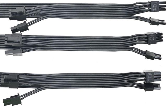 ▼3條顯示卡電源黑色帶狀模組化線路,提供6個PCIE 6+2P接頭,至第一個接頭16AWG線路