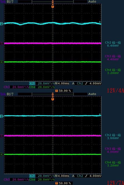 ○輸出無負載時12V無明顯漣波,輸出12V/1A時有最大12V漣波,輸出12V/7A時12V無明顯