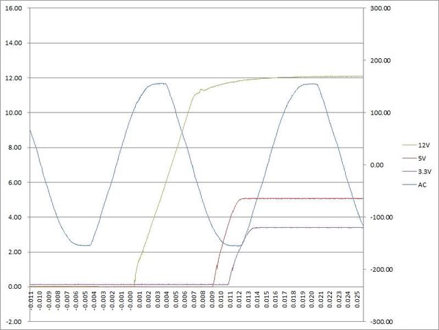 ○電源啟動至綜合全負載輸出狀態,12V上升時間16ms,5V上升時間3ms,3.3V上升時間
