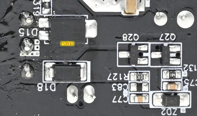 ○主電路板背面焊點做工良好,大電流線路有敷錫,隔板於二次側MOSFET導熱墊片下方開