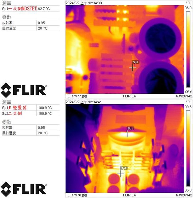 ▼電源供應器滿載輸出下一次側MOSFET(上圖)及主變壓器/二次側(下圖)的紅外線熱影像