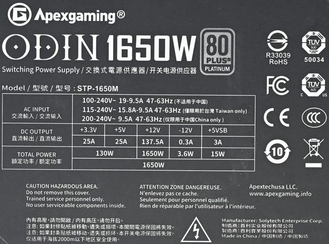 ▼本體背面標籤有Apexgaming商標、ODIN名稱、1650W輸出功率、80PLUS白金認證、型號