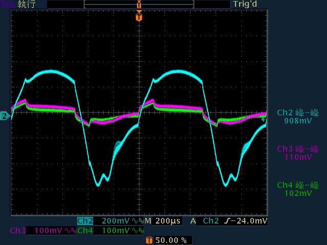○110V輸入下輸出無負載時12V無明顯漣波,輸出12V/1A至12V/4A時12V帶有較大間歇漣波