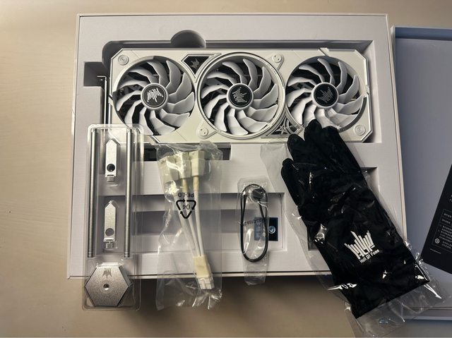 移除黑色廢紙後內容物上方為顯卡本體,下方由左至右依序為顯卡支架、轉接供電線、5v