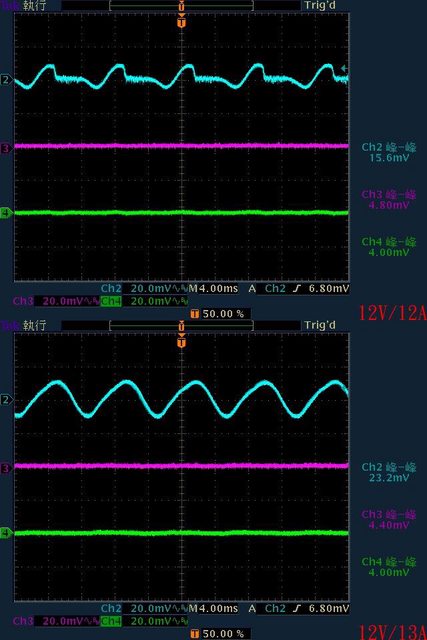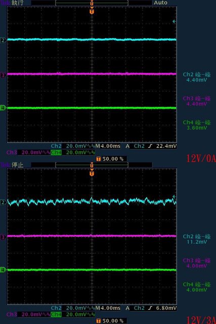 ○輸出無負載時12V無明顯漣波,輸出12V/3A時12V開始出現小振幅低頻漣波,輸出