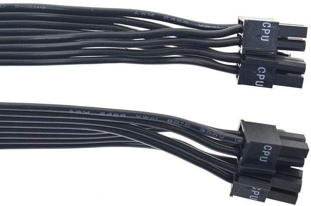 ▼2條處理器電源黑色帶狀模組化線路,提供2個EPS 4+4P接頭,16AWG線路長度65公分