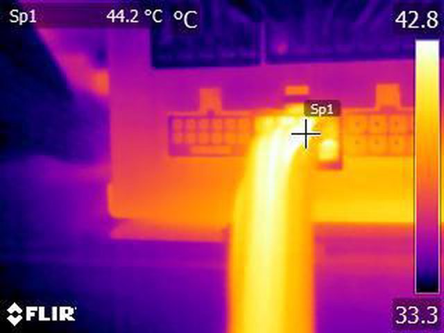 ▼單條EPS 4+4P連續輸出28A(336W)10分鐘後的電源端模組化接頭紅外線熱影像圖(附註:
