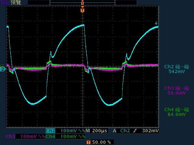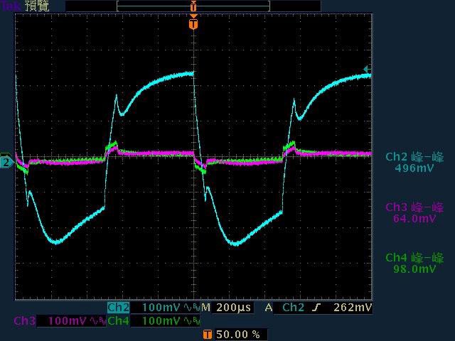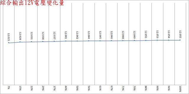 12V漣波波形固定,只改變振幅。於綜合全負載輸出下12V/5V/3.3V各路低頻漣波分別為