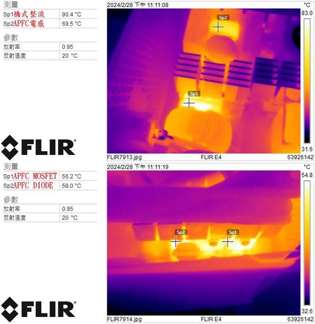 ▼電源供應器滿載輸出下橋式整流/APFC電感(上圖)及APFC MOSFET/APFC DIODE(下圖)的
