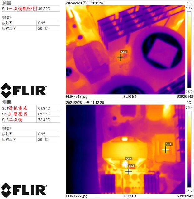 ▼電源供應器滿載輸出下一次側MOSFET(上圖)及諧振電感/主變壓器/二次側(下圖)的紅外