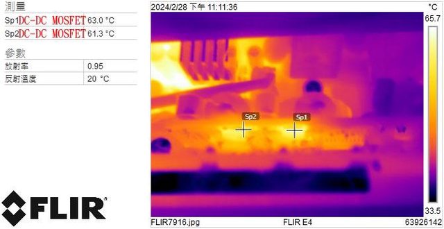 ▼電源供應器滿載輸出下DC-DC MOSFET的紅外線熱影像圖(附註:安裝位置環境溫度會影