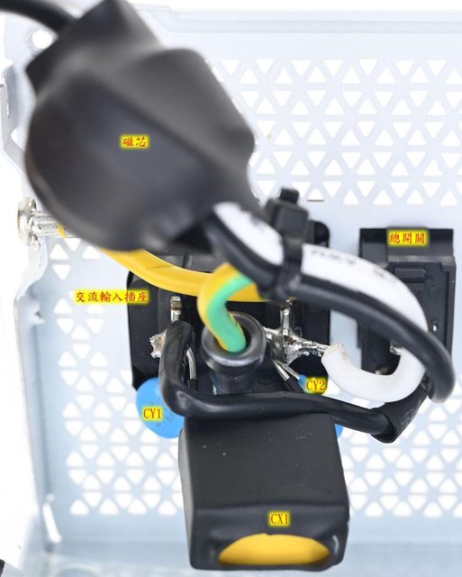 ▼交流輸入插座焊點加上2個Y電容(CY1/CY2)及1個X電容(CX1),接地線有套磁珠,X電容