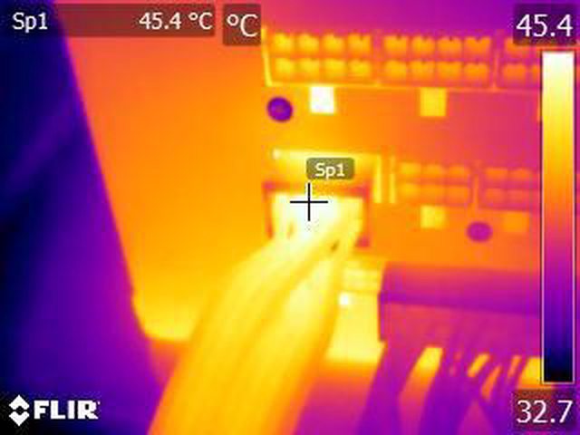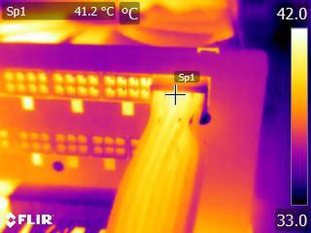 ▼單條PCIE 6+2P(雙頭)連續輸出21A(252W)10分鐘後的電源端模組化接頭紅外線熱影像圖