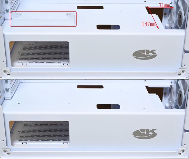 大小147×71mm,垂直擴充槽下方有PCIe延長線安裝座(紅色框),電源艙側面前方有商標