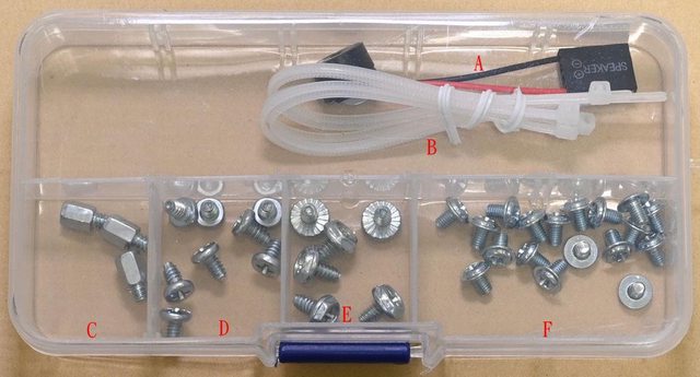 ▼隨附配件裝在透明整理盒內,有蜂鳴器(A)、塑膠束帶(B)、主機板銅柱(C)、3.5吋裝置