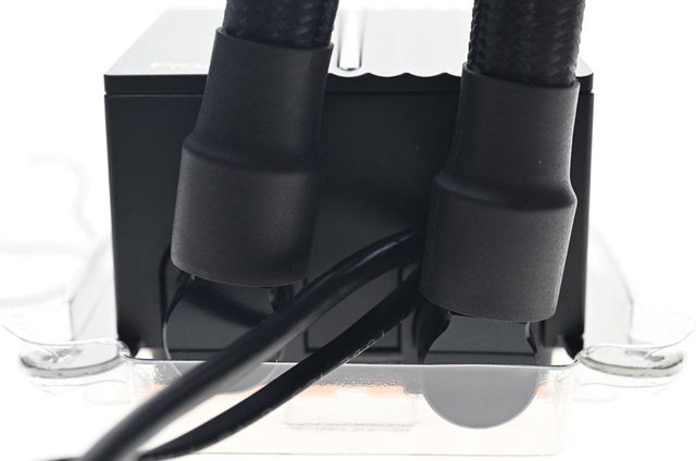 ▼水冷頭進/出水管直角接頭可小幅度左右旋轉,其中1個接頭附近接出幫浦4pin PWM線路