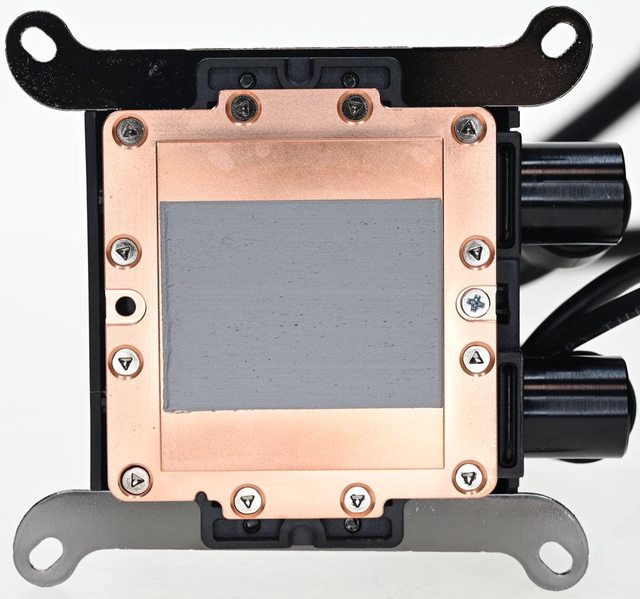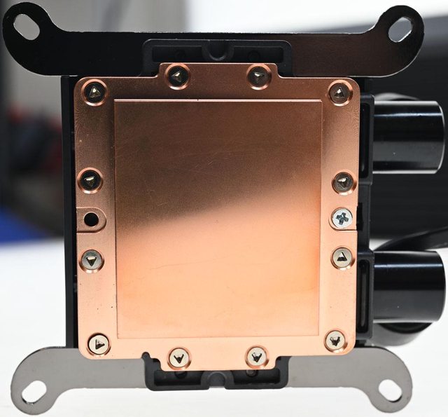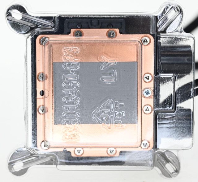 ▼水冷頭處理器接觸面外圍使用特殊沉頭螺絲固定,中間方形凸出部分尺寸47.6×41mm