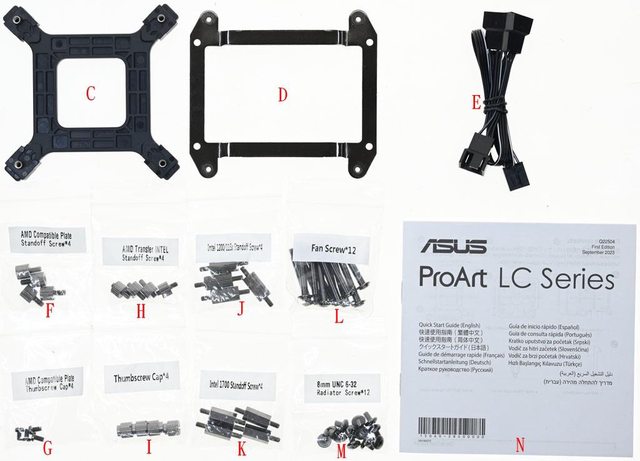 LGA1700螺柱(K)、風扇固定用長螺絲(L)、水冷排固定用短螺絲(M)、多國語言快速使用指