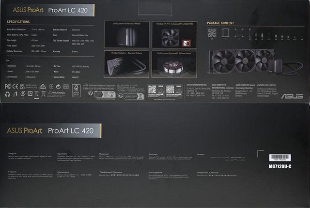 ▼外盒正面有ASUS ProArt金色標誌、ProArt LC 420 CPU LIQUID COOLER產品名稱、