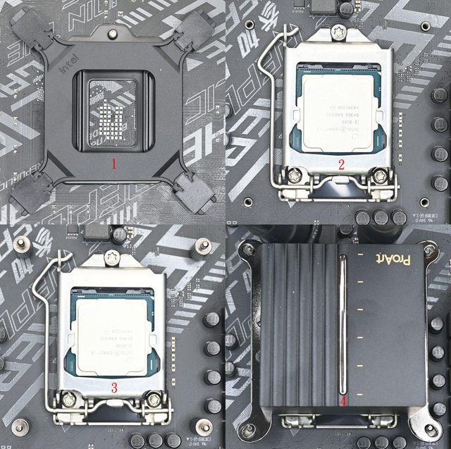 散熱器孔位會露出4支高度相同的固定鎖點(2),將4支LGA1700螺柱鎖入固定鎖點(3)。安