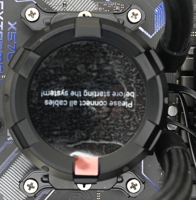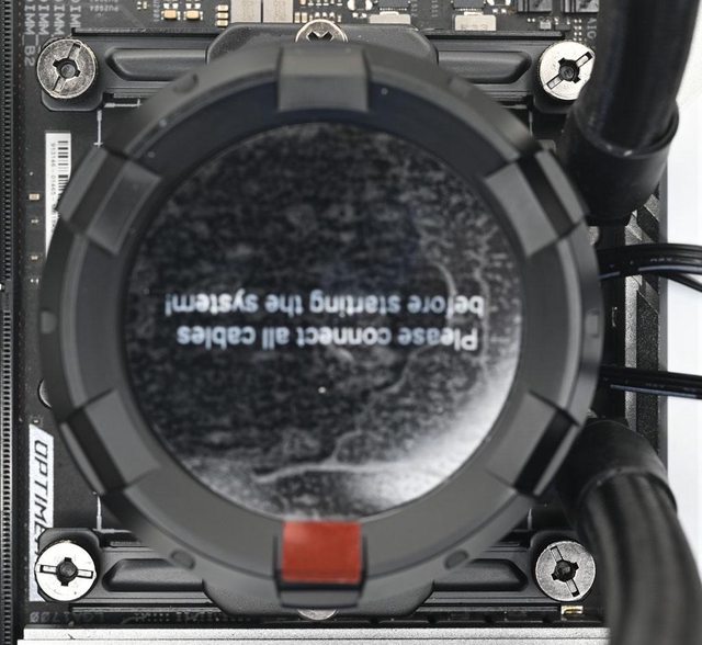 ▼水冷頭處理器接觸面有一張保護貼,上面印上"警告!安裝前移除"英文