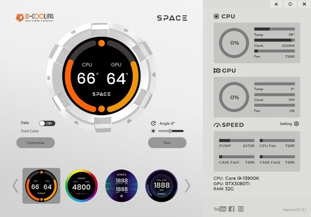 幕,專用SPACE軟體可顯示即時CPU/GPU溫度、風扇轉速、頻率、使用率等監控資訊及時間