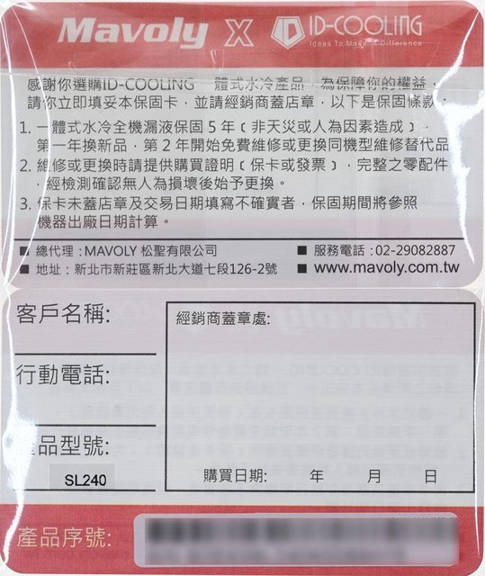 ▼保固卡,正面有保固條款說明及代理商聯絡方式,背面的登錄欄位有客戶名稱、行動電