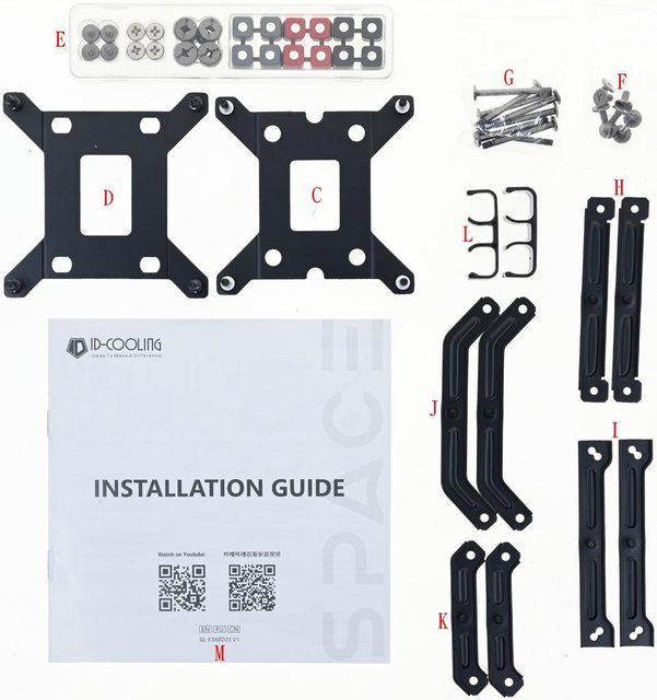 LGA1200/115x/20xx托架(I)、AMD長托架(J)、AMD短托架(K)、水冷管固定扣(L)、封面提