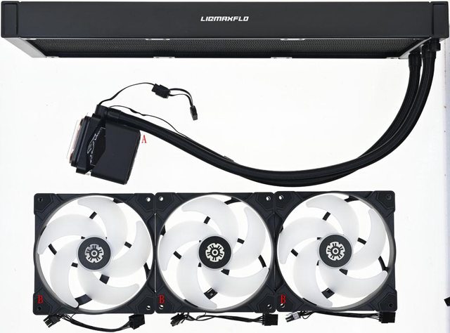 ▼包裝內容物有ENERMAX LIQMAXFLO 420一體式水冷散熱器(A)、3個UCSFARGB14P-LMF風扇