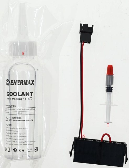 ▼水冷維護套件內有補充用水冷液(R)、電源供應器24P轉風扇4pin插針轉接線(S)、散熱